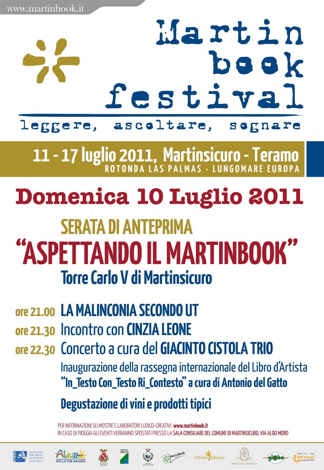 È anticipata da una serata di anteprima, che si tiene domenica 10 luglio alle ore 21 presso il Torrione di Carlo V ● Antiquarium di Castrum Truentinum, la seconda edizione del Martinbook Festival, la manifestazione culturale che animerà il lungomare di Martinsicuro dall'11 al 17 luglio.